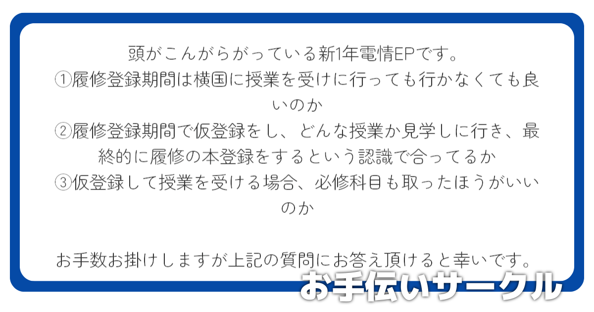 ①第一回の授業から普通に授業は始まっています。絶対に授業に行ってください。 ②認識が違います。仮登録は講義資料を見るための操作で、履修登録とは一切の関係はありません。また、理工は特に必修がきつきつで授業を選ぶ余地などありませんから、見学して授業を寄り好むなんてことはできません。時間割に載っている授業をほぼそのままそっくり取る形です。 ③必修科目は言葉の通り「必ず修める」科目なので「取ったほうがいい」ではなく必ず取ってください。また、「仮登録して―場合」と書かれていますが、授業をとる場合は必ず仮登録しますし、授業を取らない場合は仮登録しません。 この説明も分かりにくいかと思いますから、DMに来ていただいてかまいません。履修関係の誤解は致命傷になります。遠慮せず。 (Tomo.H)