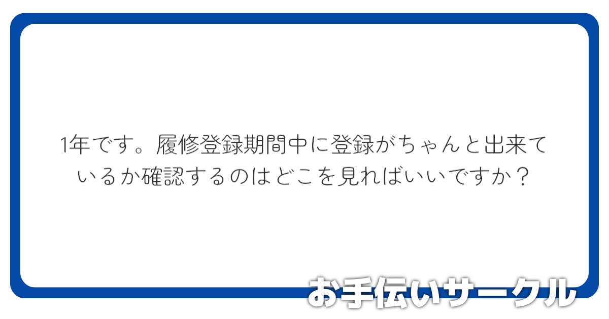 学務情報システムで、履修・成績情報 > 履修登録 と進み、「履修時間割表」をご確認ください。 表示される内容が登録した内容と一致していれば、正しく履修登録ができています。(錨)